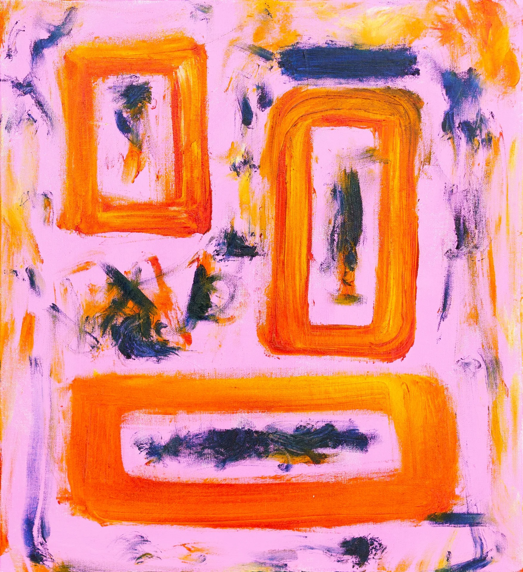 Within a field of subdued, contemplative blue, geometric forms float like memories gently held in place. A metallic orange frame encircles the composition—radiant yet restrained—marking a space that feels both personal and protected. It is less a border than a gentle enclosure for something quietly cherished. Through layered textures and nuanced pigments.
