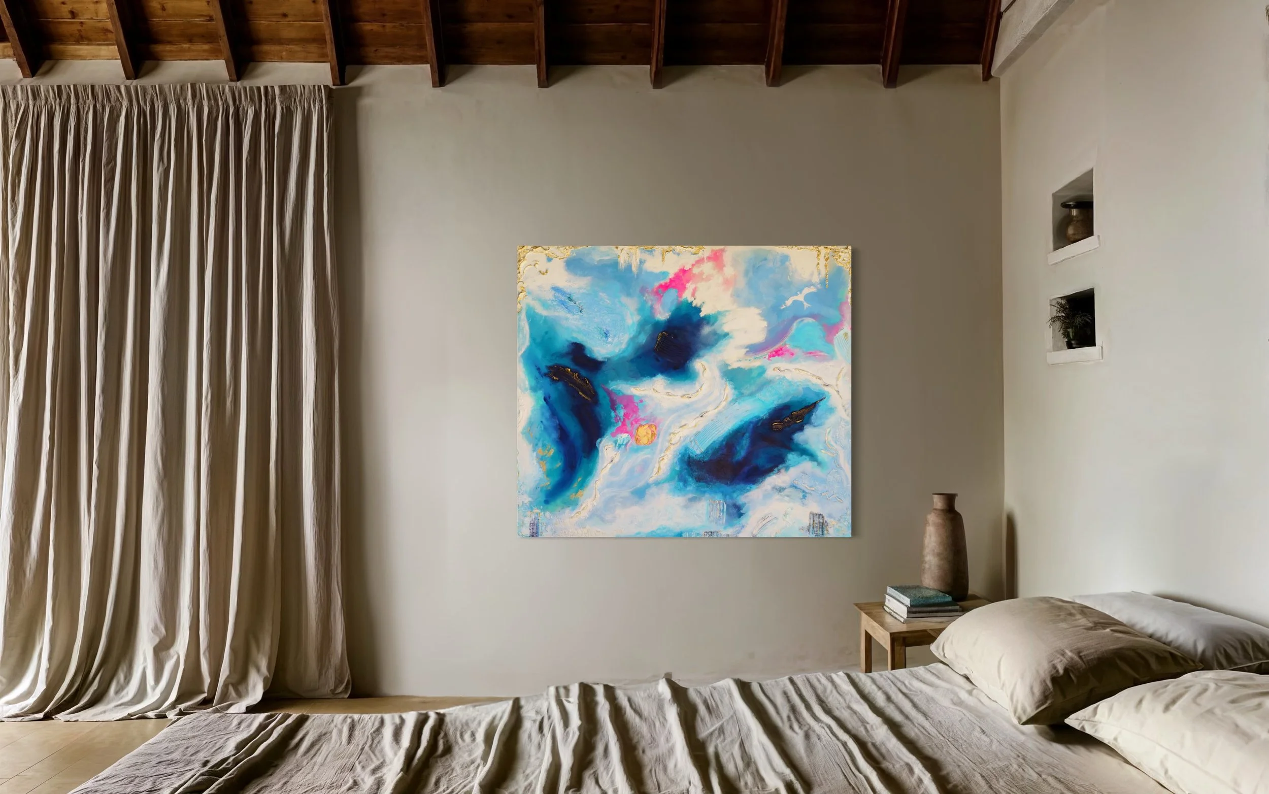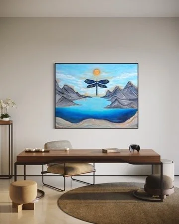 Her paintings unfold as a dance of color, intuition, and texture. Moving freely across fabric and canvas, her hands orchestrate a waltz of expression where instinct and craftsmanship intertwine. Each piece emerges as a talisman of vitality and distinction—infusing spaces with good energy and grace.